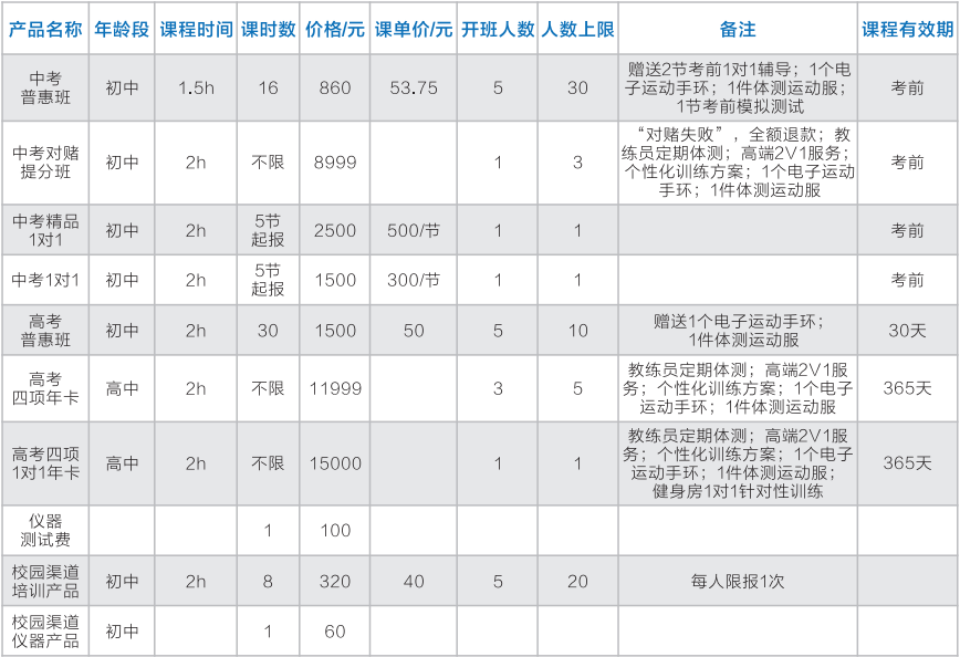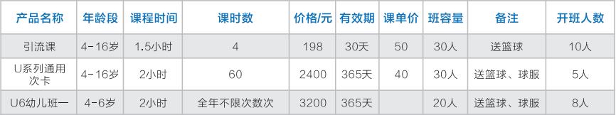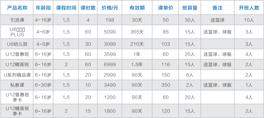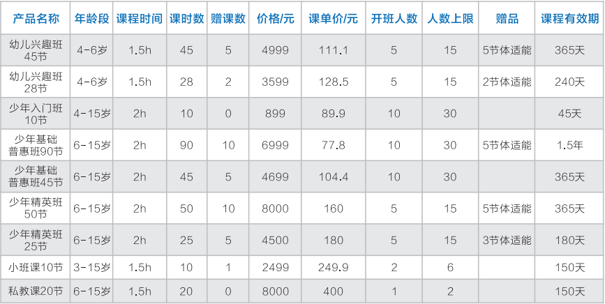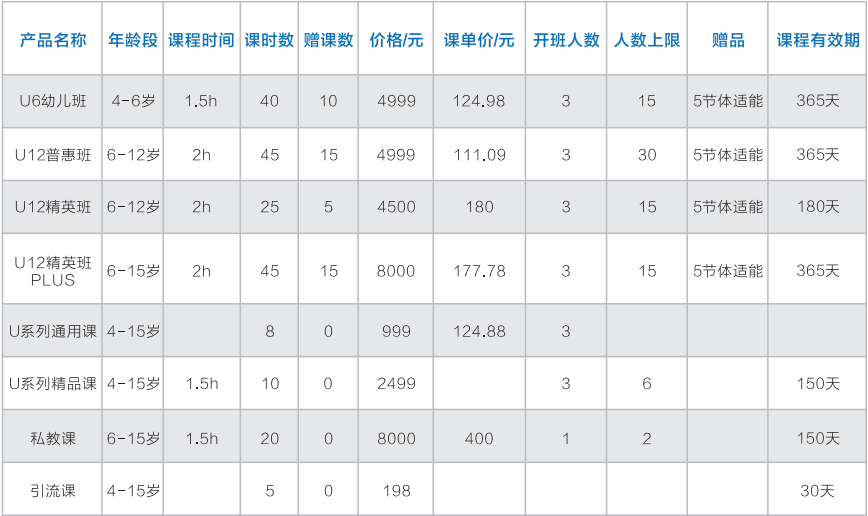 華艦動體體教融合項目組各場館共有U系列普惠班、精英班、私教課、引流課產(chǎn)品、散客卡、包場金卡、銀卡產(chǎn)品。開設(shè)培訓(xùn)班有私教一對一、一對二、一對三定制教學(xué)班及暑期培訓(xùn)班,長訓(xùn)班招生年齡為4-18周歲。暑期培訓(xùn)班每年只在7月份、8月份開展培訓(xùn),培訓(xùn)價格為普惠班 1500 元/期,課單價 100 元 ;暑期精英班 1800 元/期,課單價 120 元。
