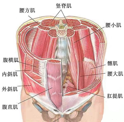 這個(gè)核心的圖像,完美地說明了腹部、盆底和腰大肌之間的關(guān)系。通過觀察腹部的橫截面(由腹橫肌、腹斜肌、腹直肌和腰方肌組成),你可以看到這些肌肉群是如何包裹整個(gè)腹部的。在這里是你的核心的主要組成部分,減去橫膈膜 (少了橫膈膜)。